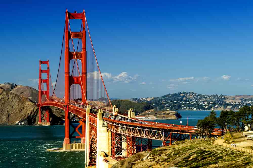 Hvordan vi krydser en bro / Hvordan vi klare overgange i vores liv! Golden gate Stillehavet til den ene side, San Francisco til den anden, og nå ja Alcatraz på vejen til San Francisco, højt solskin, solbriller, taget tilbage, vind i håret, det største smil og den...